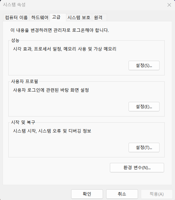 - 윈도우 검색창에 고급 시스템 설정 보기를 검색하여 들어간다.