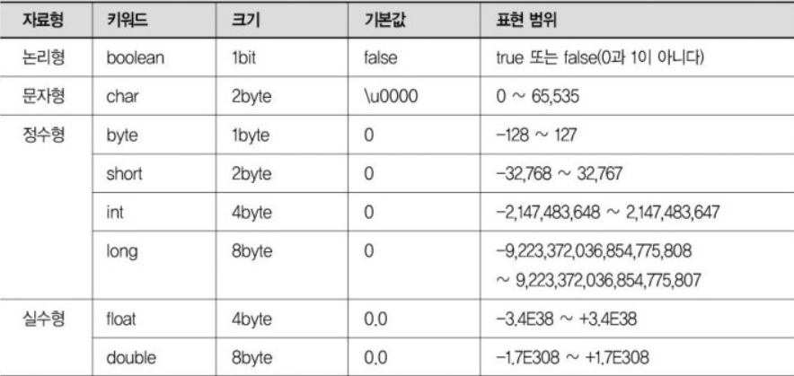 - 기본 자료형의 종류: 정수형(byte, short, int, long), 문자형(char), 실수형(float, double), 논리형(boolean)